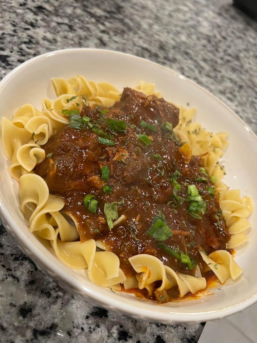 What I find that makes this Creole daube so special is its depth of flavor. A hearty mix of cajun trinity and the flavor of tomatoes comes together with Cajun spices and herbs, creating a savory gravy that’s perfect for soaking into a bed of rice or in our case, egg noodles.